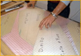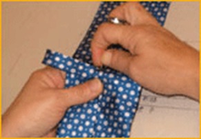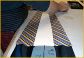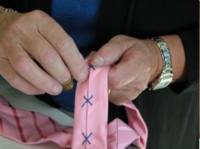 Pinning then tacking the tie, giving careful attention to match the silk pattern.